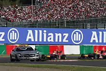 - Машина безопасности выезжает на трассу с пит-лейн, вне зависимости от местоположения лидера гонки на трассе. Все маршалы демонстрируют желтые флаги и таблички «SC». На машине безопасности загораются мигающие оранжевые огни. Все участники должны снизить скорость и выстроиться за машиной безопасности на расстоянии не больше, чем десять длин корпуса машин. Контроль снижения скорости пилотами осуществляет специальная система, указывающая минимальное время прохождения круга.