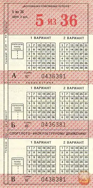 Лотерея была широко известна в СССР. Первый тираж лотереи «Спортлото» по формуле 6 из 49 прошёл 20 октября 1970 года.