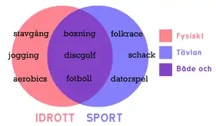 Важно понимать шведскую терминологию. В шведском языке существуют понятия sv:sport и sv:idrott. Первое означает спортообразную деятельность, имеющую соревновательный аспект, необязательно физическую; второе - активность человека с необязательной соревновательностью. Так, например, автоспорт, киберспорт и шахматы - это "строго" sport, а танцы и хореография - "строго" idrott. А вот, допустим, лыжные гонки, боевые искусства, командные игры - это и sport и idrott одновременно. Русское слово "спорт" обычно охватывает сумму этих множеств.