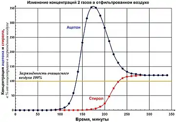 Если воздух загрязнён двумя и более газами, их молекулы мешают друг другу занимать места на поверхности и в порах активированного угля. Хуже удерживаемые молекулы вытесняются другими. В результате, после того, как сорбент насытился хуже удерживаемым веществом, он перестаёт очищать от него воздух (например, при одновременном улавливании сероводород вытесняется сероуглеродом[15]). Но в это время уже уловленные молекулы вытесняются с сорбента в воздух молекулами лучше удерживаемых веществ. Они попадают в поток воздуха, который перестал уже очищаться от этого (плохо удерживаемого) вещества, и концентрация такого вещества в прошедшем через фильтр воздухе может превысить концентрацию в не очищенном воздухе. На рисунке показано, как вытеснение молекулами стирола молекул ацетона приводит к тому, что (при использовании фильтра достаточно длительное время) концентрация ацетона в очищенном воздухе может превысить концентрацию в не очищенном воздухе в 3 раза.