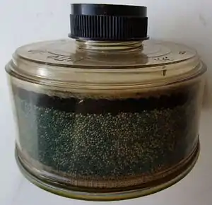 Некоторые вредные газы могут поглощаться сорбентами, как правило твёрдыми материалами с большой удельной площадью поверхости (например, активированный уголь)[11]. Обычно такие сорбенты готовят в виде гранул и наполняют ими корпус фильтра. При прохождении загрязнённого воздуха через фильтр сорбент избирательно поглощает вредные вещества, удерживая их на своей поверхности. По мере насыщения сорбент утрачивает способность задерживать газы, и загрязнённый воздух начинает проходить через фильтр. При длительной работе фильтра концентрация вредных веществ в очищенном воздухе возрастает и может превысить ПДК. Таким образом, срок службы адсорбирующих противогазных фильтров ограничен. Связывание газов на поверхности сорбента является обратимым процессом и при определённых условиях может происходить десорбция — выделение связанных газов в очищаемый воздух. Способность сорбента связывать различные газы зависит от химических свойств газов, температуры и других факторов. Для лучшего поглощения некоторых вредных газов в фильтр добавляются вещества, образующие более прочные связи этими газами. Так добавление иода улучшает поглощение ртути, солей металлов — аммиака, оксидов металлов — кислых газов[12].