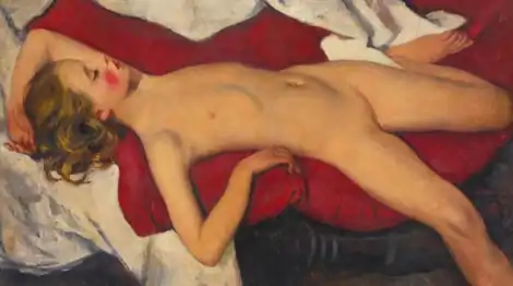 созданное ею строго и лишено чувственного смакования красоты тела. Позы моделей свободны и благородны, художница любуется гармонией и пластикой их форм… Уравновешивая объём и линейный ритм, вводя цветные драпировки, она заботится о красоте целого. Таковы холсты «Обнажённая» (1920) и «Спящая девочка на синем» («Катюша на одеяле») (1923). Последний с разметавшейся фигуркой спящей девочки, с его красивой гармонией нежно-телесного, бело-голубого и синего является подготовительным этюдом к картине, в 1924 году имевшей успех на выставке русского искусства в Нью-Йорке [«Спящая девочка на красном одеяле»].