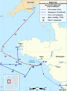 Английский флот под командованием адмирала Эдварда Хока (англ. Edward Hawke), состоящий из 23 линейных кораблей и 10 фрегатов, в жестокий прижимной шторм (ветер WNW, со стороны моря) атаковал французский флот под командованием маршала графа де Конфлана (фр. Hubert de Brienne, Comte de Conflans), состоящий из 21 линейного корабля и 3 фрегатов. В ходе первой части боя французы потеряли 2 корабля потопленными и 2 захваченными, и укрылись в заливе у полуострова Киберон. Адмирал Хок, развивая успех, вошел в бухту, потеряв при этом 2 корабля на отмели острова фр. Le Four, и атаковал укрывшийся там французский флот. В ходе второй части боя французский флот был рассеян, ещё три корабля потеряно, в том числе на мелях, один захваченный сел на мель и был сожжен.