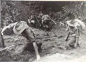 ![]() Австралийские инженеры, сыгравшие жизненно важну роль в наступлении, продвигаются вверх по склону к югу от реки Хонгорай в мае 1945 года. | |||