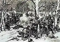 Наконец подошла старая гвардия, посреди коей находился сам Наполеон. Это было уже гораздо за полдень. Мы вскочили на конь и снова явились у большой дороги. Неприятель, увидя шумные толпы наши, взял ружье под курок и гордо продолжал путь, не прибавляя шагу. Сколько ни покушались мы оторвать хотя одного рядового от сомкнутых колонн, но они, как гранитные, пренебрегали все усилия наши и остались невредимыми… Я никогда не забуду свободную поступь и грозную осанку сих всеми родами смерти угрожаемых воинов! Осененные высокими медвежьими шапками, в синих мундирах, в белых ремнях с красными султанами и эполетами, они казались как маков цвет среди снежного поля! Будь с нами несколько рот конной артиллерии и вся регулярная кавалерия, бог знает для чего при армии влачившаяся, то как передовая, так и следующие за нею в сей день колонны вряд ли отошли бы с столь малым уроном, каковой они в сей день потерпели.
