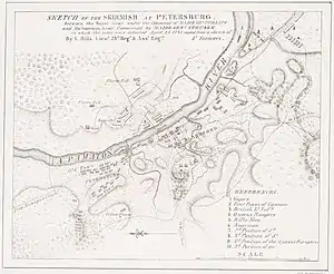 Когда началось отступление американцев, кавалерия Симко стояла на высоте к югу от Питерсберга. Увидев, что противник отступает к мосту, Симко понял, что не успеет ничем ему помешать, и решил обойти Питерсберг с запада, найти там брод, перейти на северный берег реки и постараться захватить американскую артиллерию на Бэйкер-Хилл[19].