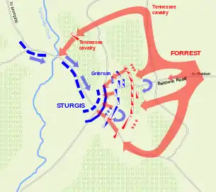 Форрест приказал 7-му Теннессийскому полку атаковать наступающих федералов в левый фланг; в полку уцелело всего 75 человек из 350-ти, и полковник Тейлор заметил, что их слишком мало, но Форрест настоял на атаке, а затем проследовал к бригаде Белла и сказал, что северяне уже разбиты, и их атакуют с тыла, и если их теперь атаковать, то с ними будет покончено. В это время 7-й Теннессийский дал залп по северянам с тыла, и они приостановил наступление, и тогда бригада Белла бросилась вперёд. Федеральная кавалерия уже три часа удерживала позицию, и на этот раз дрогнула[22].