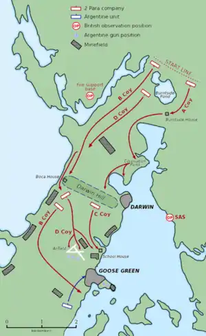 27 мая к населённому пункту выдвинулся 2-й батальон Парашютного полка (Parachute Regiment), элитного подразделения армии Британии. Атака началась ночью 28 мая. Аргентинцы оказали упорное сопротивление. Пытаясь лично возглавить захлебнувшуюся атаку, погиб командир 2-го батальона подполковник Джонс (впоследствии он был удостоен высшей воинской награды Британии — Креста Виктории). Несмотря на тяжёлые потери, британцам к исходу дня удалось занять подступы к Гус-Грин, окружив аргентинцев в самом посёлке. Перед наступлением ночи командир 2 батальона майор Крис Кибл направил к командиру Гус-Грина двух военнопленных — сержантов аргентинских ВВС с условиями капитуляции.