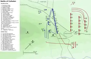 Раннее утро 16 апреля застало армию якобитов, голодную и измученную неудачным ночным маршем, на болотистой покрытой вереском пустоши Drummosie Moor вблизи Каллодена. Местность не очень хорошо подходила для излюбленной тактики «атака горцев», но тем не менее командование якобитов решило дать бой именно здесь. Такое решение, по видимому, было продиктовано необходимостью защитить Инвернесс, фактическую столицу восставших[2]. Якобиты построились в две линии, в первой находились представители горной Шотландии, во второй — батальоны лоулендеров, ирландский и французский контингенты, английские наемники[3].