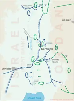 Так, 14—15 февраля Иордания обстреляла из миномётов израильские населённые пункты в районе Бейт-Шеана и вдоль долины реки Иордан; израильская артиллерия и ВВС нанесли ответный удар по иорданским базам и артиллерийским батареям и по финансировавшемуся США строительству канала короля Хусейна. При американском посредничестве было достигнуто соглашение о прекращении огня, и Хусейн заявил, что не позволит «этим группам использовать Иорданию в качестве базы для нападения».[3] В феврале он послал войска и полицию, чтобы вынудить ФАТХ покинуть Караме, но когда колонна, насчитывавшая 20 подвижных средств, прибыла в Караме, она оказалась в окружении вооружённых пулемётами боевиков. Иорданцам было дано «три минуты, чтобы решить, остаться или умереть», и они покинули Караме[4]. Согласно Б. Моррису, по состоянию на март, кроме жителей Караме (несколько сот человек), в нём также находились около 900 боевиков, в основном из ФАТХ, и лидер ООП Ясир Арафат, разместивший здесь свой штаб[3].