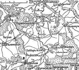![]() План сражения при Карахасанкое (рисунок из статьи «Карахасан-Киой»; «Военная энциклопедия Сытина»; 1912 год). | |||