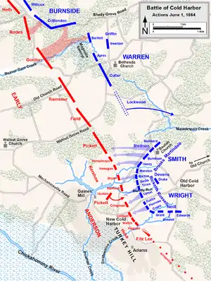 Приступ дизентерии не давал возможности Ли лично руководить операцией. Он послал к Колд-Харбору дивизию Хоука и дивизию Андерсона, который принял командование 1-м корпусом после ранения Лонгстрита.