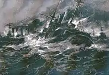 ![]() Немецкая эскадра покидает Вальпараисо 3 ноября 1914 года после боя. «Шарнхорст» и «Гнейзенау» впереди, за ними «Нюрнберг». На переднем плане корабли ВМФ Чили — броненосные крейсера «Эсмеральда», «О’Хиггинс», бронепалубный «Бланко Энкалада» и броненосец «Капитан Прат». | |||