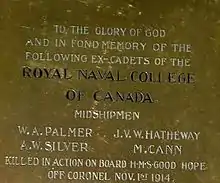 Четверо погибших канадских моряков стали первыми потерями Канады на море в Первую мировую войну. Все они были выпускниками Королевского Военного колледжа, и позднее в память о них была названа библиотека колледжа (англ. Coronel Memorial Library at Royal Roads Military College)[19]. Ныне это Королевский Дорожный университет в Виктории, Британская Колумбия, Канада[20]. Специально установленных мемориалов, посвящённых этой битве, нет. Существуют только две памятные доски, расположенные за пределами Великобритании, — в соборе Стэнли на Фолклендских островах и в 21st May Plaza в Коронеле, Чили[21].