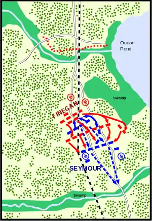 Пытаясь остановить противника, генерал Сеймур поспешно бросил в атаку бригаду полковника Уильяма Бартона. Ньюйоркцы остановили южан, и линия боевого соприкосновения на какое-то время стабилизировалась. Позиции северян с обоих флангов упирались в непроходимые болота, а поле боя представляло собой поросшую соснами пустошь, на которой почти негде было укрыться.