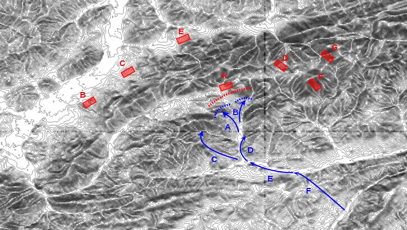 Баязид выходит к ручью, разворачивается и нападает с фланга на Узун-Гасана. Угурлу Мехмед уходит назад.