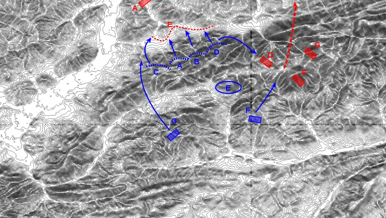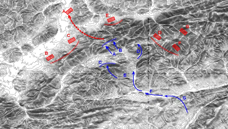 Османская армия (синие): A — Давут-паша B — Махмуд-паша C — Мустафа-челеби (сын Мехмеда II) D — шехзаде Баязид (сын Мехмеда II) E — Мехмед II F — Михалоглу Али-бей G — Искендер-бей |