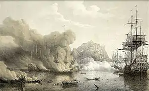 Бой последовал на следующее утро. Утром 2 июня отряд из 9 кораблей и 7 галер, под командованием контр-адмирала Прельи, атаковал правый фланг союзников. Французские корабли стали на шпринг напротив правого фланга союзников, то есть напротив испанских кораблей, в расстоянии одного кабельтова от них. Шпринги завели с таким расчетом чтобы нападающие могли стрелять всем бортом. Ветер дул прямо в бухту, и под прикрытием порохового дыма были пущены брандеры. Испанские корабли не выдержали натиска, испанский флагманский корабль первым обрубил канат и перлинь от шпринга и выбросился на берег, где вскоре совсем сгорел; его примеру последовали большинство других испанских кораблей, они начали рубить канаты и сдавать вглубь бухты, но все-таки у испанцев было сожжено брандерами 3 корабля: 40-пушечные «Сан-Антонио де Наполес», «Сан-Сальватор де Фландрес», 44-пушечный «Сан-Фелиппе» и уничтожены артиллерийским огнём 2 галеры: «Сан-Сальвадор» и адмиральская галера «Сан-Хосе», на которой погиб испанский адмирал Хуан де Вильяроэль.
