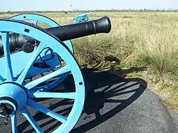В 14:30 началась артиллерийская дуэль, которая длилась около часа. Мексиканские орудия, несмотря на грамотное управление, оказались слишком малого калибра и их снаряды часто давали недолёт. Между тем американские орудия действовали эффективно сверх ожиданий, иногда за один залп выбивая целый кавалерийский взвод[9]. Улисс Грант, в то время лейтенант 4-го пехотного полка, вспоминал, что «артиллерия состояла в основном из 6-фунтовых бронзовых орудий, которые вели огонь только ядрами; но у генерала Тейлора были при себе три или четыре 12-фунтовые гаубицы, стреляющие снарядами, а также 18-фунтовые орудия, эти были дальнобойными. Это было мощное вооружение. Мексиканская армия была вооружена примерно такими же ружьями, как у нас, но их артиллерия вела огонь только ядрами. У нас было серьёзное преимущество в этом виде оружия»[10].Следует также учесть, что поле боя было густо заросшим остроконечной травой, которая, по свидетельству очевидцев, легко протыкала одежду и ранила солдат. Мексиканская армия была обута в сандалии, а некоторые из солдат были вообще босоногими, поэтому каждое перемещение мексиканцев вело к ранениям солдат и падению боевого духа.