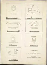 - Одна 32-фунтовая на Северном бастионе; одна 32-фунтовая, одна 8-дюймовая гаубица и одна длинная 12-фунтовая на Южном бастионе; одна морская 32-фунтовая на южном фланке бастиона; два 24-фунтовые в люнете; одна морская 8-дюймовая гаубица на редане.