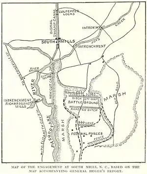 В то же день северяне высадились около Элизабет-Сити, в 16 милях от городка Саус-Майлз. Одна бригада была дезориентирована агентами юга и оказалась в 30 милях от нужного места, из-за чего общее наступление было отложено до следующего дня.