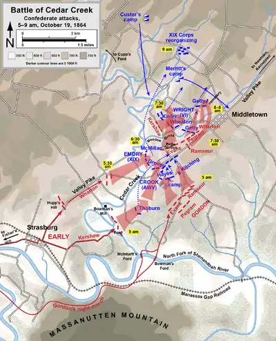 Вечером 18 октября Эрли начал строить свои войска в три колонны. Колонне Гордона (дивизии Рамсера, Пеграма и Эванса) предстояло проделать самый долгий путь, поэтому она выступила раньше всех, сразу после заката, примерно в 20:00. Они осторожно прошли узкое дефиле между рекой Шенандоа и отрогом горы Массанутен. Колонны Уартона и Кершоу выступили примерно в час ночи 19 октября и в 03:30 все три колонны были на позициях для атаки. Кавалерия Россера приготовилась наступать по западной стороне долины. Кавбригада Пейна (300 чел.) была придана колонне Гордона с тем, чтобы выйти к Белл-Гроув и захватить Шеридана в его штабе. Южане не знали, что Шеридана нет в штабе в это утро.
