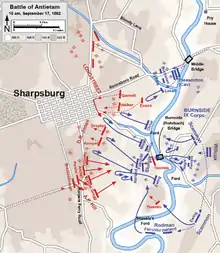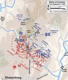 Сраже́ние при Энти́теме (англ. Battle of Antietam[4]), Сражение при Антиетаме[5], Cраже́ние при Ша́рпсберге (англ. Battle of Sharpsburg)[''i'' 2] — сражение Мэрилендской кампании в ходе Гражданской войны в США. Произошло 17 сентября 1862 года у города Шарпсберг (штат Мэриленд) и реки Энтитем-Крик (англ. Antietam Creek), между федеральной армией (командующий Джордж Макклеллан) и армией Конфедерации (командующий Роберт Ли). Стало первой крупной битвой на территории Севера и осталось самым кровопролитным однодневным сражением в американской истории: с обеих сторон погибло около 3600 человек[6]. Военный историк С. Морисон считает одной из причин поражения южан то, что генерал Ли недооценивал значение нарезного оружия (винтовок) в бою на открытой равнинной местности[7].