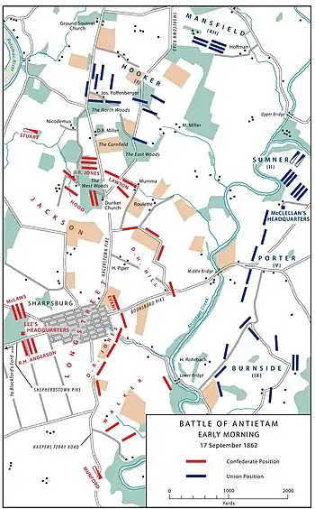 Сражение началось на рассвете, около 05:30, 17 сентября, атакой I федерального корпуса Джозефа Хукера. Хукер двигался на плато, где располагалось «Данкер Чёрч», здание, принадлежавшее церкви немецких баптистов. Хукер имел примерно 8600 человек, немногим более, чем у Джексона (7700), но и это небольшое преимущество сводилось на нет сильными оборонительными позициями южан (Пьерро пишет о 9438 у Хукера[17], Маль пишет о 12 500 у Хукера и 4000 у Джексона[27]).