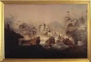 Это развязало Дюкену руки. Он послал сначала Турвиля с двумя кораблями на помощь своему авангарду, но потом, убедившись, что де ла Серда боится сблизиться для решительного боя, приказал поставить все паруса на всех судах своей эскадры и провел её мимо неприятельского авангарда, сосредоточив на нём огонь. Три концевых голландских корабля ему удалось последовательно вывести из строя; они на буксире галер были выведены из под огня и отведены в Сиракузы; два других голландских корабля были сильно повреждены.