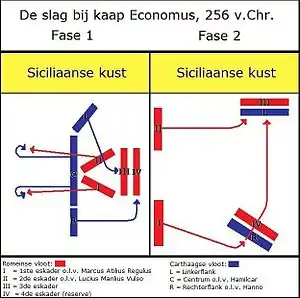 Римский флот был разделён на 4 эскадры по числу легионов. Двигался он тремя линиями. Впереди шли первый и второй флоты, возглавляемые двумя консульскими гексерами, во второй линии находился третий флот, буксировавший парусные грузовые суда. Четвёртый флот образовывал третью линию. Перед сражением 1-я, 2-я и 3-я эскадры развернулись в одну линию, а 4-я стала у берега, прикрывая грузовые корабли. Гамилькар с кораблями центра первоначально отступил, увлекая за собой два консульских флота, затем развернулся и вступил в битву. Левый фланг карфагенян сковал силы 3-й римской эскадры, а правый фланг, возглавляемый Ганноном, обошёл консульские корабли и атаковал 4-ю эскадру. Карфагеняне прижали половину военного флота и грузовые корабли к берегу, но упорное сопротивление римлян продолжалось.