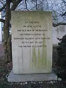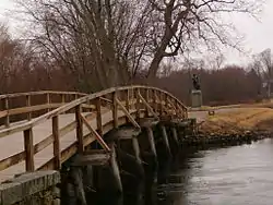 Этим залпом были убиты два человека в голове колонны колонистов: рядовой Эбнер Хосмер и капитан Исаак Дэвис, оба из минитменов Актона. «Американцы шли колонной по двое, — вспоминал потом пастор Рипли, — и когда они были в десяти или пятнадцати футах от моста, британский солдат выстрелил из ружья, и пуля прошла под рукой полковника Робинсона и легко ранила в бок Лютера Бланчарда, флейтиста актонской роты».