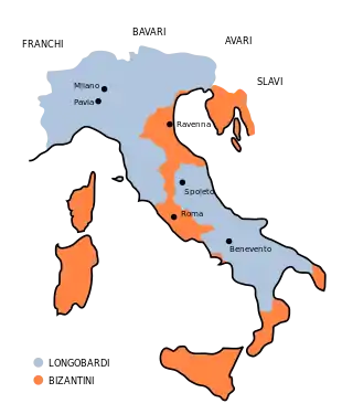 В 568 году лангобарды проникли из Паннонии в Италию и шаг за шагом овладели Фриулем, Венецией и Лигурией. Павию, которая была взята после трёхлетней осады, лангобардский король Альбоин сделал столицей своего государства; греки были оттеснены к Равенне и в южную Италию. После умерщвления Альбоина 36 герцогов решили не избирать короля, а продолжать завоевания самостоятельно. Нашествие франков в 584 году повело, однако, к избранию Аутари, который отразил франков, бывших в союзе с греками, и доставил облегчение покорённому римскому населению. Окончательное примирение с последним состоялось, однако, только при Агилульфе (590—615), который принял католицизм.