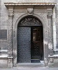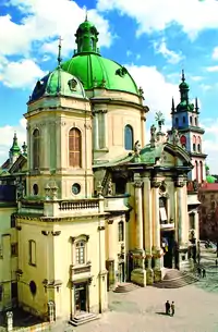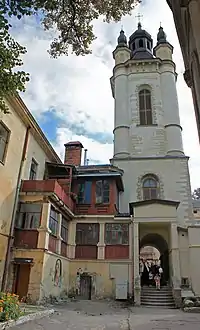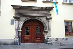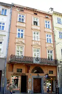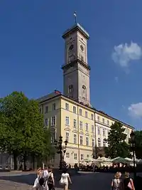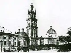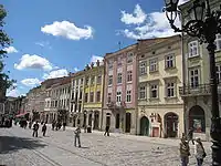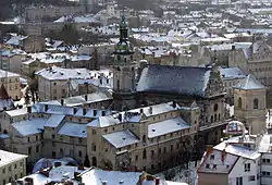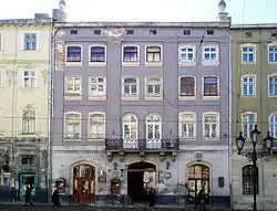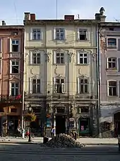 Дом № 17, сегодня выдержанный в стиле рококо, был построен в 1574 году для богатого саксонца Франца Венинга, вскоре ставшего бургомистром Львова. На углу площади Рынок и улицы Печатной находится каменица «Под оленем» (дом № 45), примечательная готическими подвалами и арками первого этажа[136]. В центре площади Рынок расположен комплекс городской ратуши XIX века. Наиболее раннее упоминание о ней датируется 1381 годом, когда в результате пожара сгорела деревянная ратуша нового средместья. В 1404 году к ратуше пристроили галерею для трубача, а на башне установили часы. В конце XV века ратуша была кардинально перестроена: в 1491 году архитектор Ганс Штехер воздвиг новую башню с аттиком. Однако в 1527 и 1571 годах она сильно пострадала от очередных пожаров. До наших дней сохранились лишь некоторые фрагменты средневековой ратуши, ныне находящиеся в разных местах (статуи двух сидящих львов с гербовыми щитами, декорировавшие карниз, несколько львиных скульптур с фасада и рельеф, изображающий лодку с гребцами)[137]. Первым строением в стиле барокко стал костёл иезуитов, начатый в 1610 году[138].
