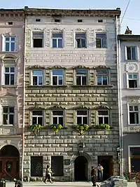 В этом же году по проекту Павла Римлянина и при участии Павла Счастливого была построена Венецианская каменица (дом № 14). Она принадлежала далматинскому купцу Антонио ди Массари, который в качестве консула представлял во Львове интересы Венеции (его статус подчёркивал крылатый лев святого Марка, размещённый над порталом дома). Характерным элементом фасада являются ромбовидные камни и завитки оконных наличников. На углу площади Рынок и улицы Кафедральной находится монументальный дом Шольц-Вольфовичей (дом № 23), построенный на средства богатой силезской семьи с элементами итальянского и немецко-фламандского Возрождения. Угол третьего этажа украшает скульптурная группа «Крещение Христа» работы Яна Зарембы[132].
