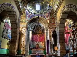 Согласно первоначальному замыслу собор представлял собой крестово-купольный храм византийского типа. Купол покоился на двенадцатигранном барабане. Тип четырёхстолпного храма и кладка купола специфичны для армянской архитектуры, но наличие трёх боковых апсид, пристроенных в XV веке, характерны для восточноевропейской традиции (кроме того, в 1437 году с южной стороны собора была построена открытая аркада в средиземноморском стиле). Во время реставрации собора в 1925 году в оконных нишах были открыты остатки фресок, датируемые первой половиной XVI века. Из скульптурных памятников сохранилась надгробная плита умершего в 1551 году патриарха Стефана с элементами готики и ренессанса, а также вмурованные в стены ризницы рельефы XVI века («Фома неверующий» и «Святая София с дочерьми»), по всей видимости снятые с надгробных памятников разрушенного кладбища[115].