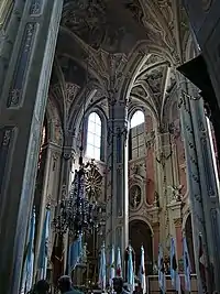 С середины XIV века во Львове началось развитие готики западноевропейского образца. Первой «ласточкой» среди культовых сооружений стал Латинский собор, заложенный во второй половине XIV века и отчасти сохранивший черты первоначального готического облика (после поздней перестройки и многочисленных наслоений элементы готики сохранились в пресвитерии, экстерьере алтарной части, внешних контрфорсах и узких стрельчатых окнах собора). Его первыми архитекторами были Петер Штехер и Николай Гонзаго, затем — Иоахим Гром и Амвросий Рабиш, а закончил храм в 1493 году Ганс Штехер (Блехер). Но фактически собор остался незаконченным, так как изначально нефы планировалось перекрыть шестью сводами, а было возведено только три. При пожаре 1527 года обрушились своды хора и возвышавшаяся над ними башня, но восстанавливали собор уже зодчие ренессансной эпохи[102][107][108].