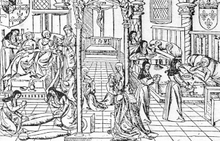 В 1398 году актёры-любители из числа беднейших горожан поставили под Парижем мистерию Страстей Господних. Власти города препятствовали их деятельности, так как объединение не имело королевского разрешения. Актёры создали для представления мистерий «Братство Страстей Господних» (фр. Confrèrie de la Passion) и обосновались у ворот Сен-Дени в больнице Святой Троицы. 4 декабря 1402 года король Карл VI дал «Братству» разрешение на постановку сцен из жизни Христа, а также «святых, праведников и праведниц» — так был основан первый в Европе стационарный театр[87].