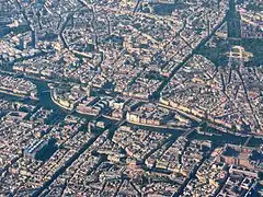 К началу раннего Средневековья в нём ещё были заметны следы галло-римского города. В западной части Ситэ находился дворец римского наместника, а в восточной — храм Юпитера. По периметру острова возвышались крепостные стены с двумя воротами у мостов (на строительство этих стен в середине IV века пустили часть камней разрушенного германцами римского города). На левобережье, на холме Сент-Женевьев (современный V округ, кварталы вдоль бульвара Сен-Мишель) и вокруг него были видны остатки римского форума с храмом, малыми и большими термами, акведуком, дворцами, лавками и амфитеатром, а вершину холма Монмартр венчал храм Меркурия (в 1133 году Людовик VI основал на Монмартре бенедиктинское аббатство, а в конце XV века остатки римских терм были включены в состав аббатства Клюни). Но значение античной Лютеции для формирования дальнейшей планировки города было весьма существенным. Направление старой римской дороги, пересекавшей Ситэ, предопределило развитие города не только вдоль реки, но и вдоль этой оси юг — север (сейчас она проходит по улице Сен-Жак на левобережье, улице де ла Ситэ, пересекающей остров поперёк, и улице Сен-Мартен на правом берегу; параллельно ей идёт линия бульваров Сен-Мишель и Севастопольского)[8][9][6][7][10].