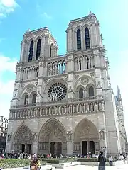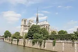 Блестящим образцом готического зодчества является собор Парижской Богоматери (Нотр-Дам-де-Пари), возвышающийся в восточной части острова Ситэ. Около 550 года на месте античного храма Юпитера по велению франкского короля Хильдеберта I была построена базилика Святого Этьена, к которой примыкали баптистерий, посвящённый Иоанну Крестителю, и церковь Богоматери (здесь же была резиденция епископа Германа Парижского). В середине XII века было решено их перестроить и фактически возвести новый, более вместительный храм. Строительство, начатое по инициативе парижского епископа Мориса де Сюлли в 1163 году, велось долго и завершилось лишь в 1343 году (именно тогда были созданы капеллы между контрфорсами и венец капелл вокруг хора). Грандиозный по тем временам собор, способный единовременно вместить около 10 тыс. человек (длина — 130 м, ширина — 108 м, высота башен — 69 м, высота сводов — 39 м), стал своеобразным образцом для всего средневекового храмостроения во Франции. Вокруг собора Нотр-Дам-де-Пари располагались монастырь Богоматери, соборные школы и дома каноников[56][14][57].