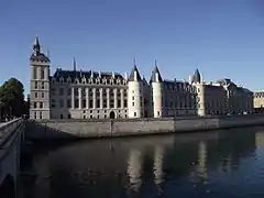 Западную часть острова Ситэ занимает громадный комплекс Дворца правосудия. Его северный фасад, выходящий к правому протоку Сены, даёт яркое представление о суровом королевском замке с тюрьмой и сокровищницей, где хранили казну. Три из сохранившихся башен датируются XIII веком, а угловая башня была построена столетием позже (на ней были установлены колокол, возвещавший весь Париж о рождении королевского наследника, и первые в городе башенные часы). После того как в XIV веке король Карл V переселился в более просторный Лувр, в старой резиденции монарха остались парламент, счётная палата и другие правительственные органы. В 1417 году канцлер Франции был назначен на должность консьержа, то есть привратника королевского жилища, отчего замок и получил название Консьержери. В XIX веке здание было существенно расширено, тогда же был оформлен фасад, обращённый к площади Дофина[59][60][23].