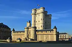 Романское зодчество, со всей его проработанностью архитектурных форм и композиций, стало лишь предвестником формирования нового архитектурного стиля — готического, который зародился именно во Франции. И поскольку Париж был столицей, он неминуемо превратился в главную «строительную лабораторию» нового архитектурного мышления. В восточном парижском пригороде Венсен сохранилось в несколько изменённом виде сооружение, заложенное в эпоху раннего Средневековья и сложившееся в эпоху готики — Венсенский замок, одно время являвшийся королевской резиденцией. К 1370 году строительство замка, начатое в XI веке, было завершено. На территории, окружённой мощной стеной и рвом, возвышается жилая башня — донжон. Почти квадратный в плане массив 52-метрового донжона фланкируют четыре угловые круглые башенки. Попасть в замок можно было только через подъёмный мост, переброшенный через ров, и крепостные ворота в стене с девятью башнями. По верху мощных стен проходил боевой ход, который прикрывали навесные бойницы (машикули). Здесь, несколько в стороне от центра Парижа, был создан замкнутый придворный мирок, имевший даже свою небольшую часовню. В современном виде весь комплекс, превращённый в исторический музей, представляет собой характерный памятник средневековой архитектуры XIV века[54][14].