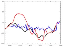 Тем не менее, в докладе МГЭИК 2013 года (AR5)[1] признается реальность тёплой средневековой климатической аномалии (Medieval Climate Anomaly) в период с 950 по 1250 годы.