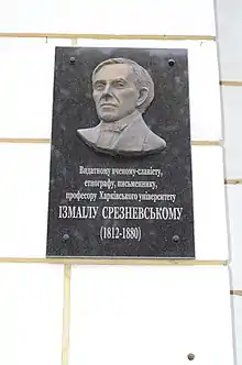 - Мемориальная доска ученому-слависту, профессору Харьковского Университета И. И. Срезневскому в г. Харькове. Шукач. Дата обращения: 17 сентября 2017.
