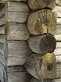 Брёвна в срубе укладываются одно на другое («в клеть»), а в углах соединяются «в чашу» (или «в обло») — с выступающими концами брёвен, — либо «в лапу» (или «в зуб») — без выступа, — а также другими соединениями.