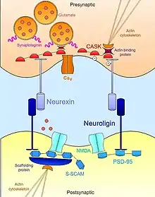 Помимо их внеклеточного связывания друг с другом, нейрексины и нейролигины внутриклеточно взаимодействуют с целой сетью адаптерных белков и каркасных структур, что, во взаимодействии с актиновым цитоскелетом, помогает правильно локализовать необходимые компоненты для осуществления синаптической передачи. Например, первый обнаруженный нейролигин (NLGN1), идентифицированный по его PDZ-домену, связанному с хорошо известным каркасным белком PSD95 в глутаматэргических синапсах, функционально связывает NMDA-рецепторы с локусом на постсинаптической мембране.[24] Схожим образом другая изоформа нейролигина (NLGN2) взаимодействует с каркасным белком гефирином, специфическим для ГАМК-эргических синапсов, и отвечает за активацию адаптерного синаптического белка коллибистина.[25] Внутриклеточные взаимодействия нейрексинов не менее важны в осуществлении важнейших механизмов синаптической передачи. Как и нейролигины, нейрексины обладают PDZ-доменом, связанным с кальций-кальмодулин-зависимой киназой. В дополнение к способности фосфорилировать саму себя и нейрексин, кальмодулин-зависимая киназа способствует взаимодействию между нейрексинами и актин-связывающими белками, обеспечивая прямую связь, посредством которой нейрексины модулируют динамику цитоскелета, что, в конечном итоге, имеет важное значение для синаптической пластичности и стабильности. Нейрексин может также связывать синаптотагмин, белок, встроенный в мембрану синаптических пузырьков; помимо этого, он способствует связыванию с потенциал-зависимыми кальциевыми каналами, которые опосредуют ионный ток, необходимый для экзоцитоза нейротрансмиттеров.[26] Таким образом, нейрексин и нейролигин координируют морфологические и функциональные аспекты синапса, что, в свою очередь, позволяет возникающим, незрелым контактам стабилизироваться в полноценные функциональные платформы для нейротрансмиссии.