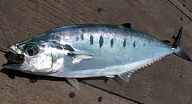 Верхняя часть тела голубоватая, нижняя — серебристая или серебристо-белая. По бокам тела расположены 5—8 чёрных пятен овальной или продолговатой (ориентированы вертикально) формы; первые 4—5 пятен пересекают боковую линию. У молоди пятна слабые или отсутствуют. Передняя половина лопасти второго спинного плавника тёмная. Лопасть анального плавника белая[2][3].