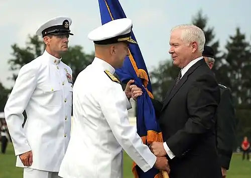 | Министр обороны США Роберт Гейтс передаёт флаг Европейского командования ВС США адмиралу Джеймсу Дж. Ставридису (30 июня 2009 года) | Джеймс Дж. Ставридис передаёт Филипу М. Бридлаву командование Верховным главнокомандованием ОВС НАТО в Европе (13 мая 2013 года) |