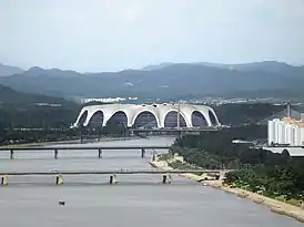 Вид на стадион и монумент идей Чучхе.