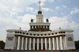 - В Москве — «сталинские высотки» (здания МГУ, МИД и Министерства транспорта, жилые дома на Котельнической набережной и Кудринской площади, гостиницы «Ленинградская» и «Украина»), Архитектурные сооружения ВДНХ. Ансамбли Тверской улицы, Кутузовского, Ленинского, Ленинградского проспектов, проспекта Мира, Краснопрудной[11][12], Русаковской, Щербаковской и других улиц, Лубянской, Суворовской и других площадей Садового кольца. Архитектура канала имени Москвы. Архитектура станций Московского метрополитена второй — пятой очередей.