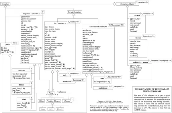 | vector[1] | C-подобный динамический массив произвольного доступа с автоматическим изменением размера при добавлении/удалении элемента. Доступ по индексу за . Добавление-удаление элемента в конец vector занимает амортизированное время, та же операция в начале или середине vector — . Стандартная быстрая сортировка за . Поиск элемента перебором занимает . Существует специализация шаблона vector для типа bool, которая требует меньше памяти за счёт хранения элементов в виде битов, однако она не поддерживает всех возможностей работы с итераторами. |